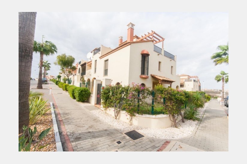 Adosado de esquina en venta en Costa Esuri Golf con aprox. 127m² construidos, 3 dormitorios con armarios empotrados, 3 baños (1 en-suite), cocina semi-amueblada y una azotea. En la primera planta, 2 terrazas, en la planta baja 2 terrazas y jardín privado de aprox. 150m². Situado en pequeña urbanización con piscina y jardín comunitario y parking reservado.