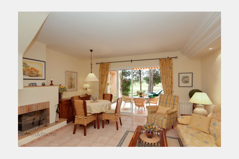 La planta baja cuenta con un acogedor salón-comedor con chimenea, una cocina amueblada con lavavajillas y horno, dispone de un lavadero, seguido de un patio cubierto y un aseo de invitados. A través del salón-comedor se accede a la terraza del jardín privado con vistas al hoyo 2 del campo de golf adyacente.